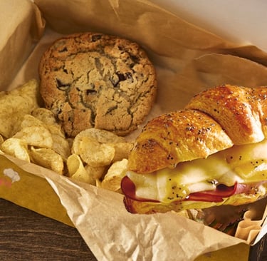 Includes a hearty sandwich, crunchy potato chips, and your choice of a fresh-baked cookie or a rich cake slice. The perfect mix of savory and sweet — our top choice for offices and events.