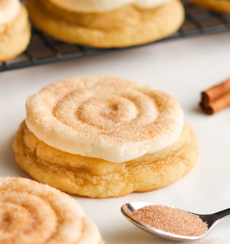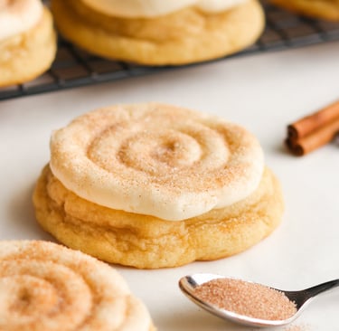 A soft cookie infused with aromatic cinnamon, topped with creamy, tangy cream cheese icing, capturing the essence of a cinnamon roll.