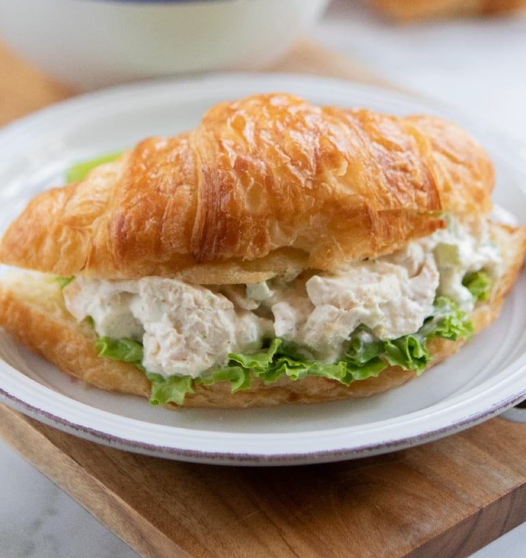 Tender chicken salad nestled in lettuce and a soft croissant.